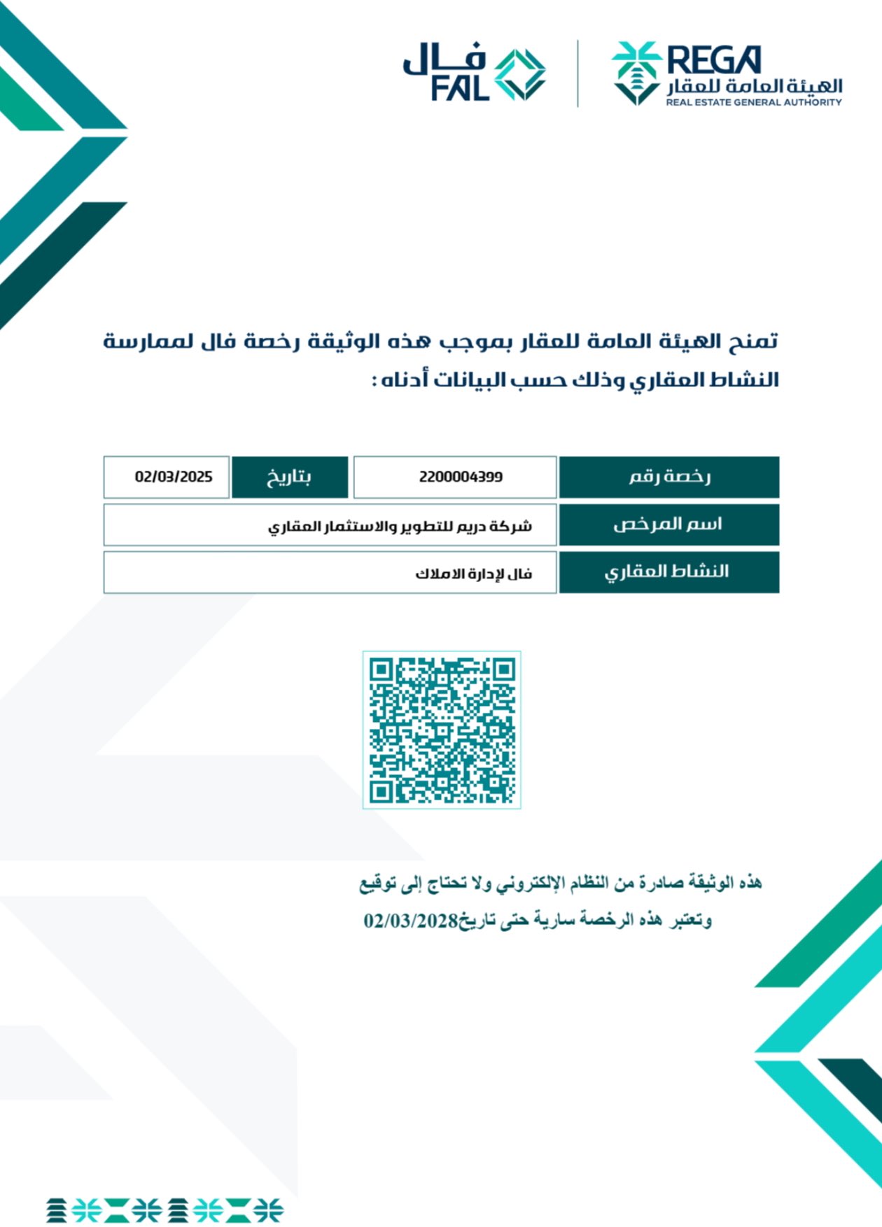 كما حصلت الشركة على رخصة "فال" للوساطة والتسويق العقاري من...